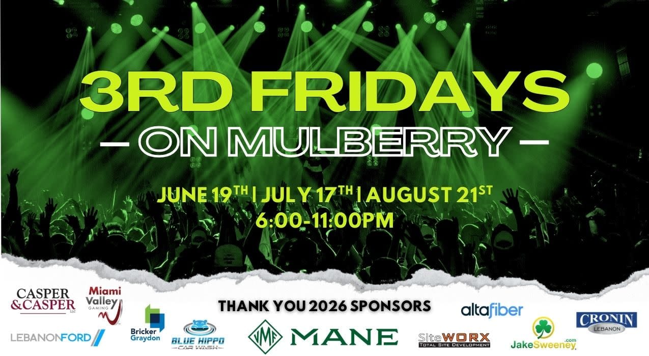 Kick off summer with 3rd Fridays on Mulberry, Lebanon’s premier summer concert series! Held on the third Friday of each month from June-August, this lively event brings the community together for an unforgettable evening of live music and summer fun. 🎶 Live Music: Enjoy performances by talented bands and artists, filling Mulberry Street with incredible sounds. 🍔 Food & Drinks: Indulge in delicious food truck offerings and refreshing beverages. 🛍️ Local Vendors: Browse unique goods from local artisans and businesses. 🎉 Festive Atmosphere: Dance, sing, and soak up the summer vibes with friends and neighbors.