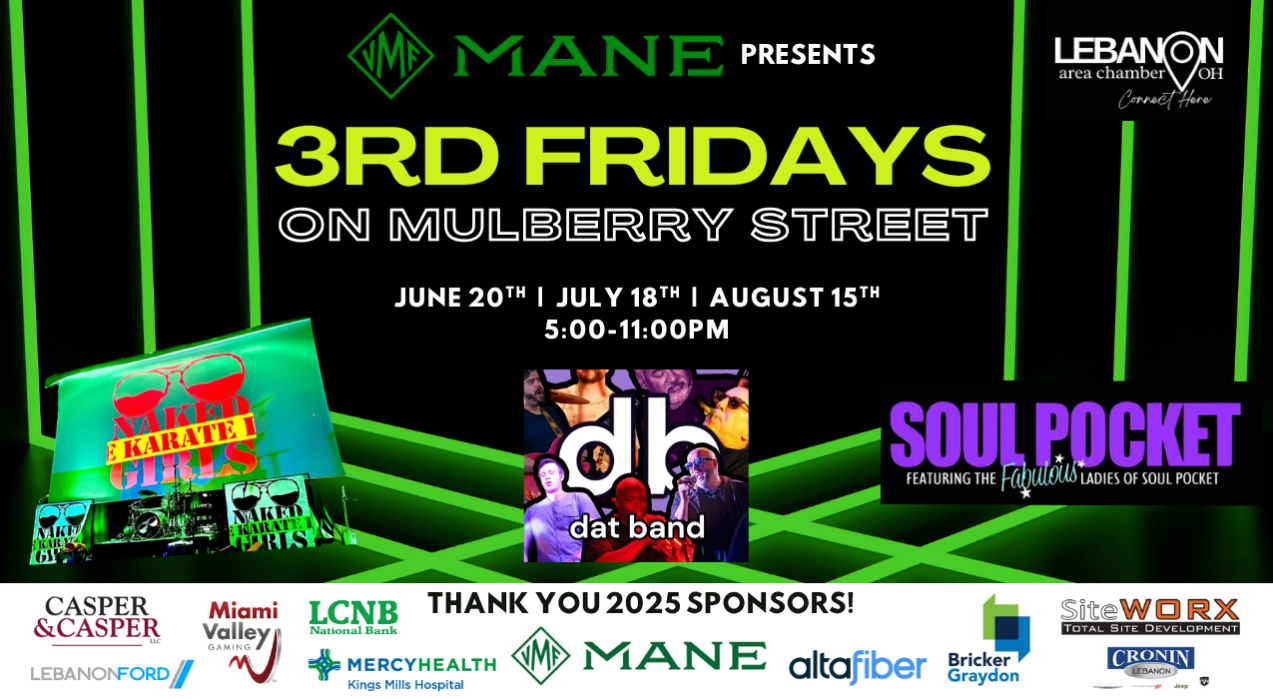 Kick off summer with 3rd Fridays on Mulberry, Lebanon’s premier summer concert series! Held on the third Friday of each month from June-August, this lively event brings the community together for an unforgettable evening of live music and summer fun. ๐ŸŽถ Live Music: Enjoy performances by talented bands and artists, filling Mulberry Street with incredible sounds. ๐Ÿ” Food & Drinks: Indulge in delicious food truck offerings and refreshing beverages. ๐Ÿ›๏ธ Local Vendors: Browse unique goods from local artisans and businesses. ๐ŸŽ‰ Festive Atmosphere: Dance, sing, and soak up the summer vibes with friends and neighbors.