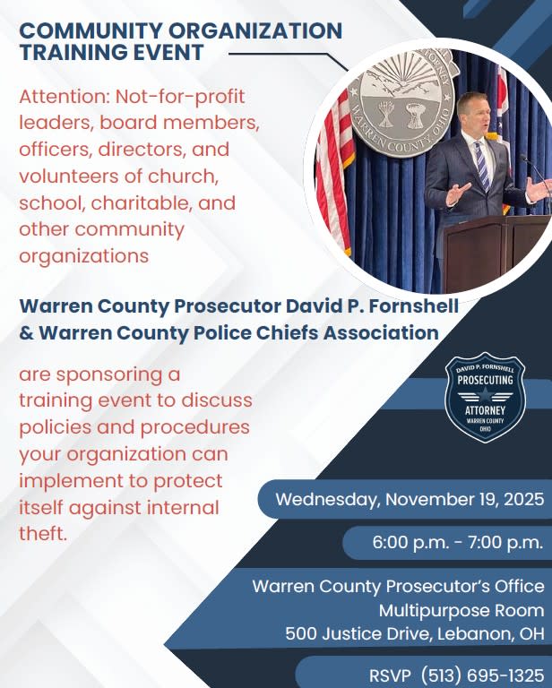 The Warren County Prosecutor and Warren County Police Chiefs Association are once again sponsoring a free community organization anti-theft training. Please see attached flyer for details. The training will be held in the Warren County Prosecutor’s Office, Second Floor, Multipurpose Room. Attendees will need to enter through Common Pleas Court Building located at 500 Justice Drive, Lebanon, Ohio 45036.
