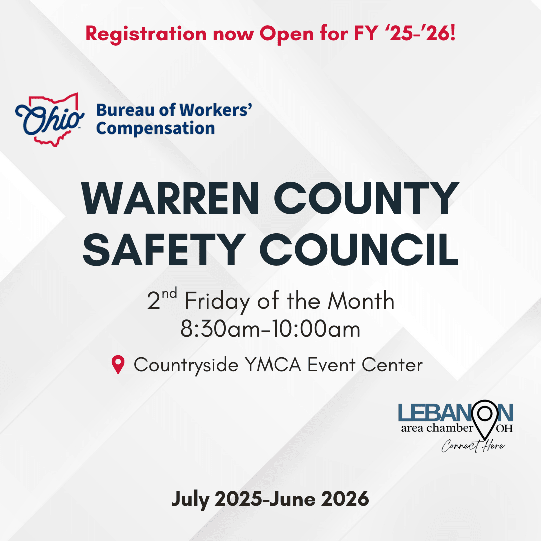 Enhance your workplace safety and compliance with the Warren County Safety Council, a key monthly event hosted by the Lebanon Chamber of Commerce in collaboration with the Ohio Bureau of Workers' Compensation. Held on the second Friday of each month at 8:00am, this series offers a valuable platform for learning, networking, and discussing critical safety topics relevant to today’s work environments.Images
