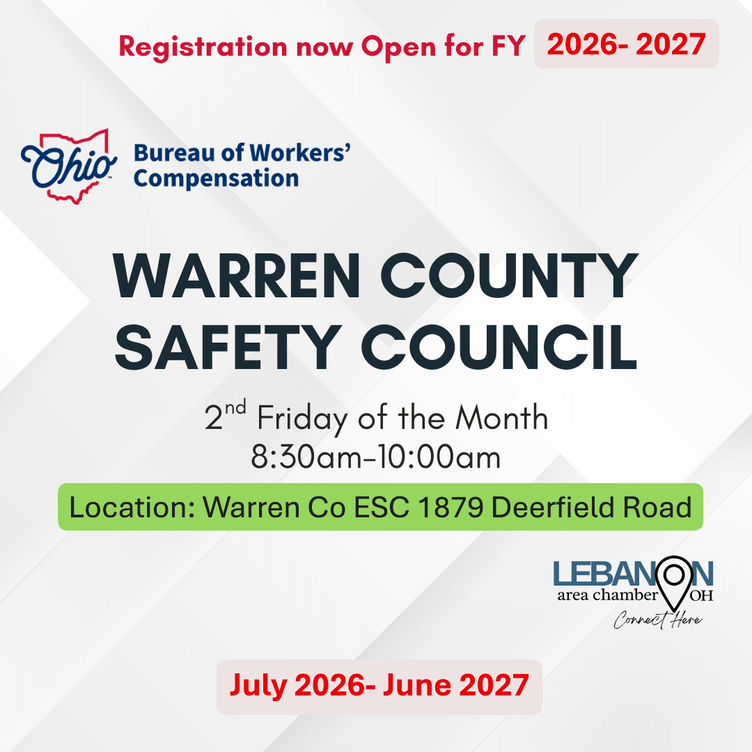 Enhance your workplace safety and compliance with the Warren County Safety Council, a key monthly event hosted by the Lebanon Chamber of Commerce in collaboration with the Ohio Bureau of Workers' Compensation. Held on the second Friday of each month at 8:00am, this series offers a valuable platform for learning, networking, and discussing critical safety topics relevant to today’s work environments.Images