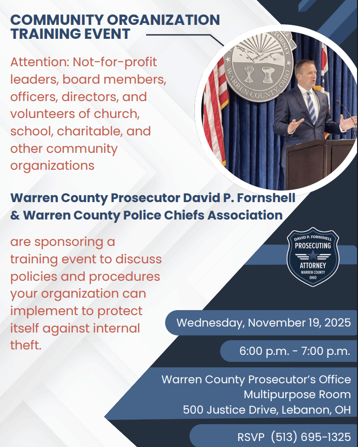 The Warren County Prosecutor and Warren County Police Chiefs Association are once again sponsoring a free community organization anti-theft training. Please see attached flyer for details. The training will be held in the Warren County Prosecutor’s Office, Second Floor, Multipurpose Room. Attendees will need to enter through Common Pleas Court Building located at 500 Justice Drive, Lebanon, Ohio 45036.