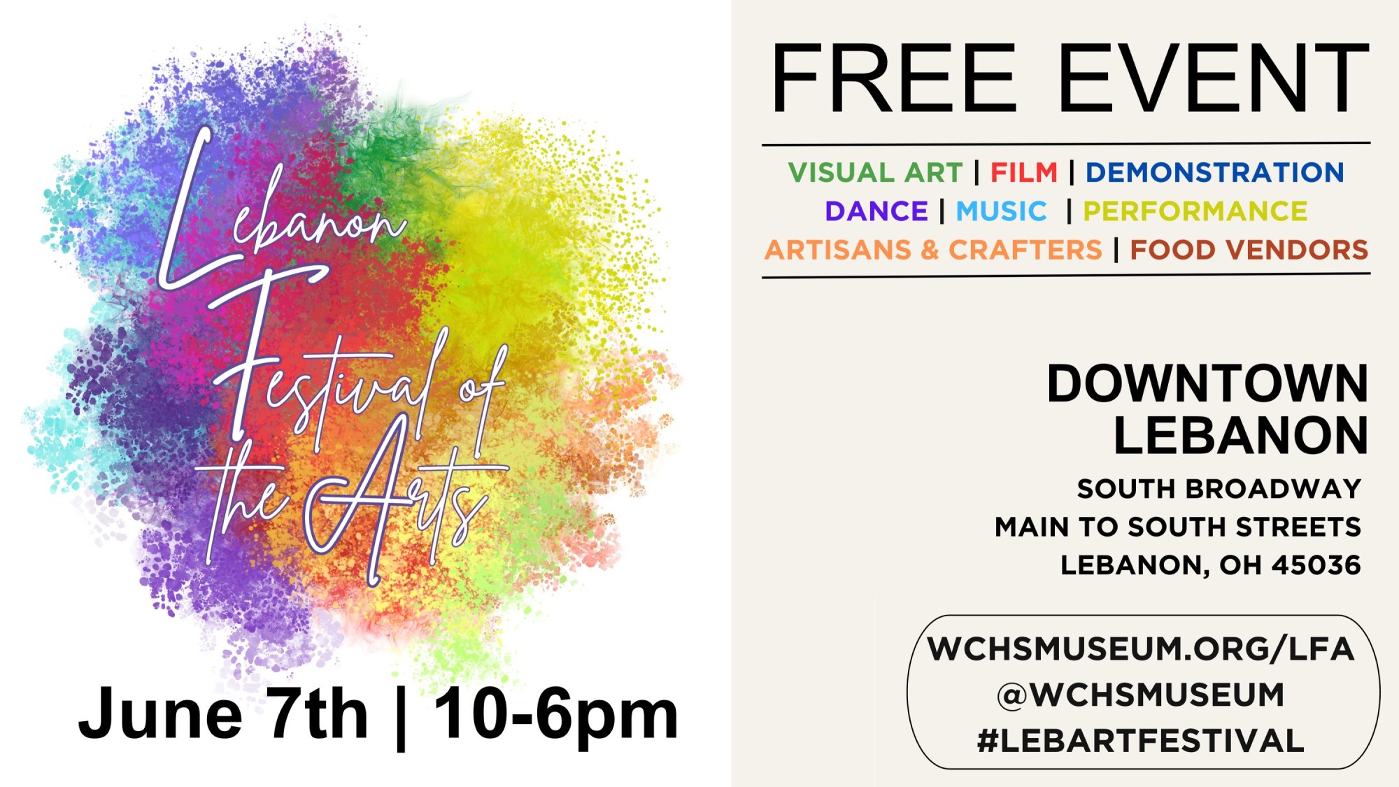 For more information, visit wchsmuseum.org/lfa, follow @wchsmuseum, and explore event updates using #LebArtFestival. Please note: This event is organized by the Warren County Historical Society. The Lebanon Area Chamber of Commerce is pleased to help support and promote this community celebration.