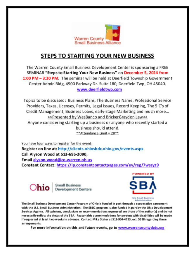 Warren County Small Business Development Center FREE SEMINAR “Steps to Starting Your New Business”