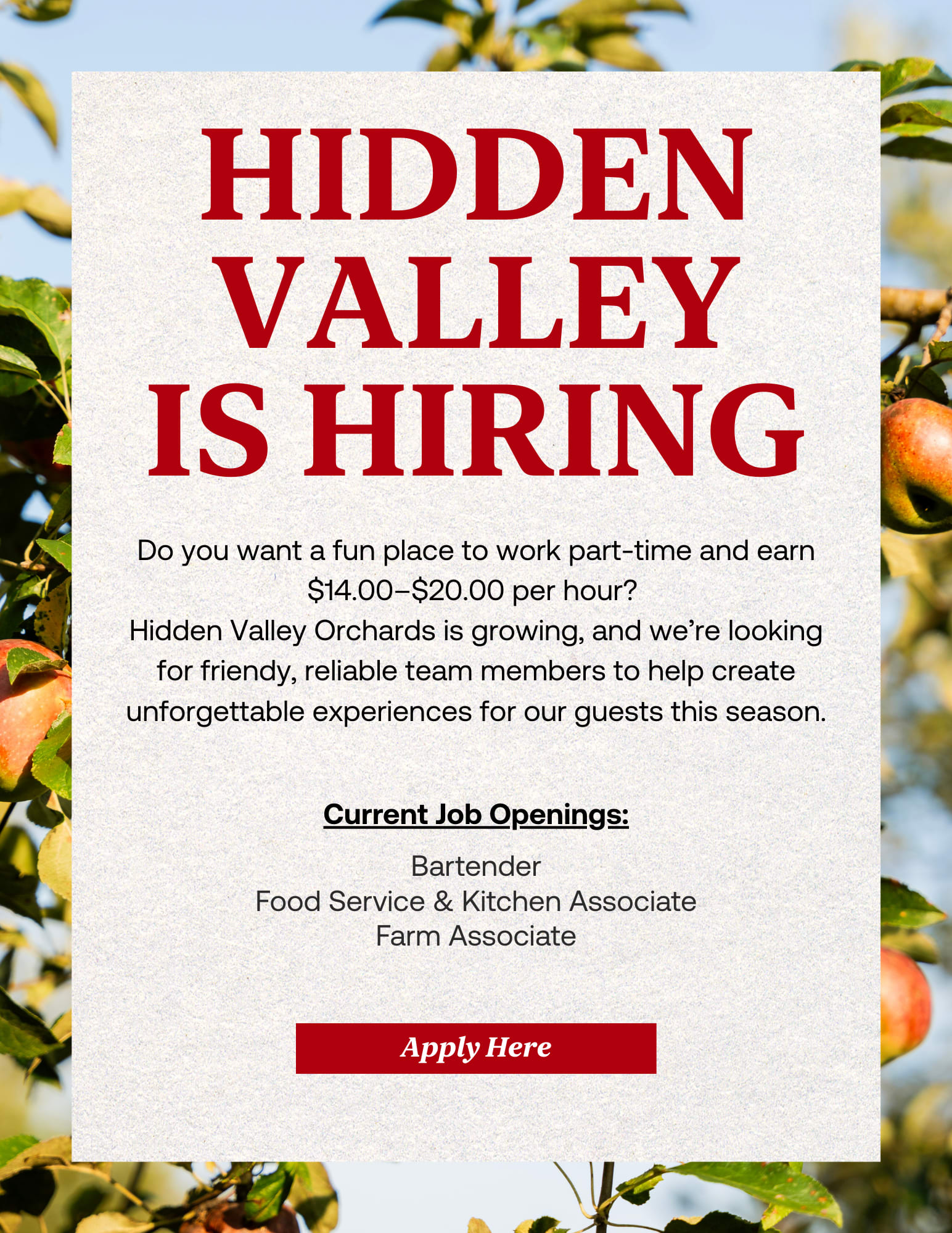 Hidden Valley is Hiring Back to Employment Opportunities Hidden Valley is Hiring By Hidden Valley Orchards 3/15/2026 Images × Share × Email Facebook LinkedIn X Pinterest Powered By GrowthZone